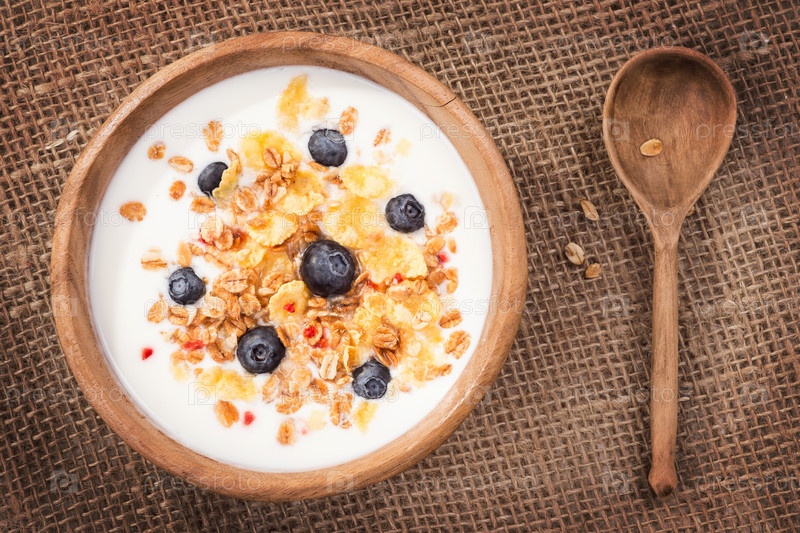 Мюсли с йогуртом и свежей черникой. Вид сверху
