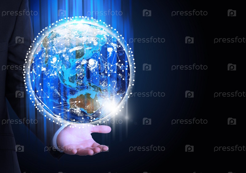 Человек в костюме держит Землю в руках
