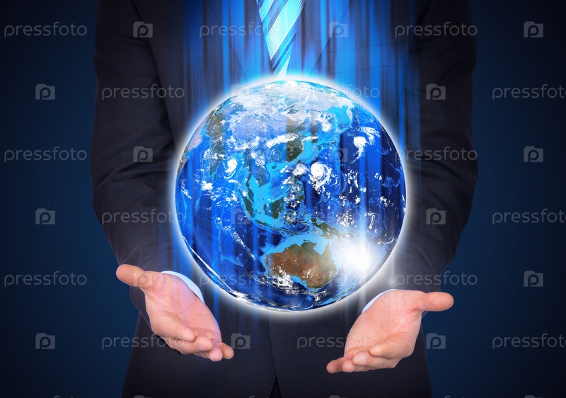 Человек в костюме держит Землю в руках
