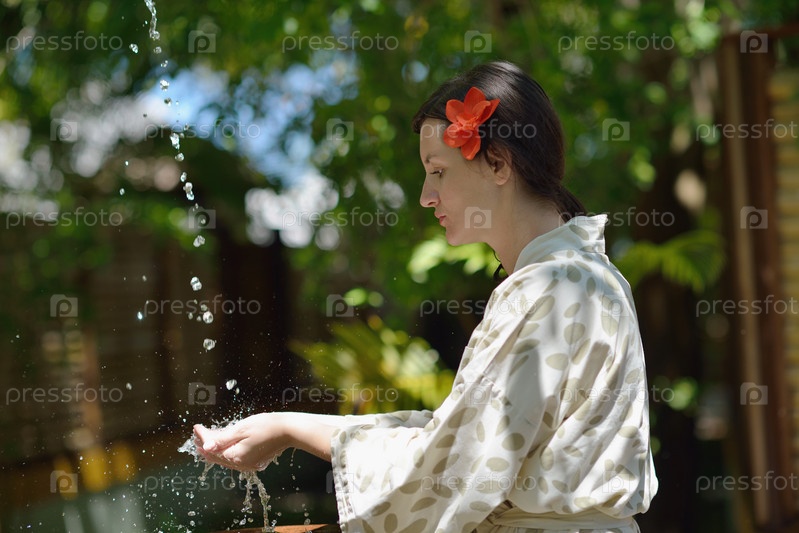 Чистая вода льется на руки женщины в спа