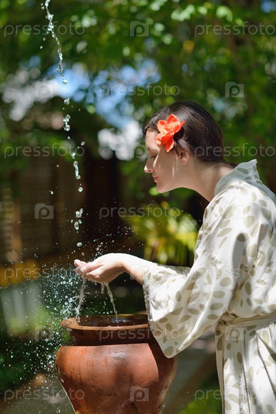Чистая вода льется на руки женщины в спа