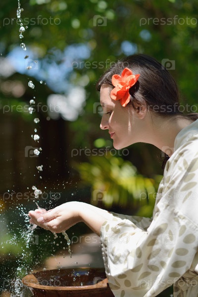 Чистая вода льется на руки женщины в спа