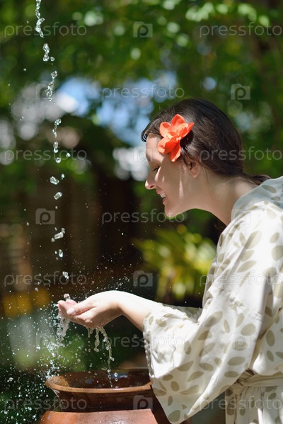 Чистая вода льется на руки женщины в спа