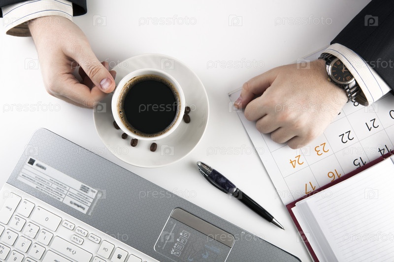 Человек и чашка кофе на рабочем месте