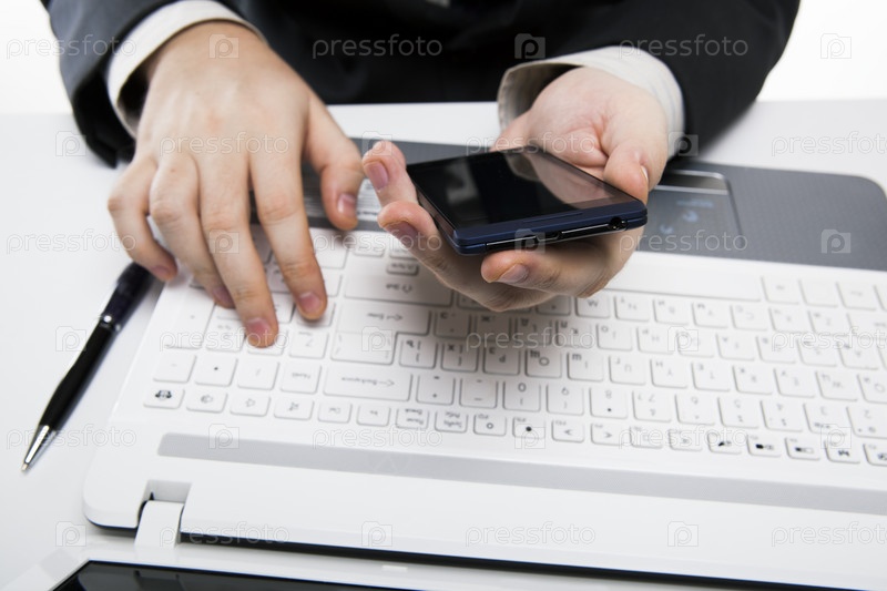Пальцы на клавиатуре ноутбука и смартфон в руке