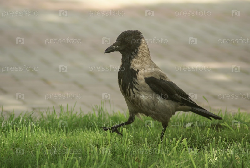 Ворона прохаживается по газону
