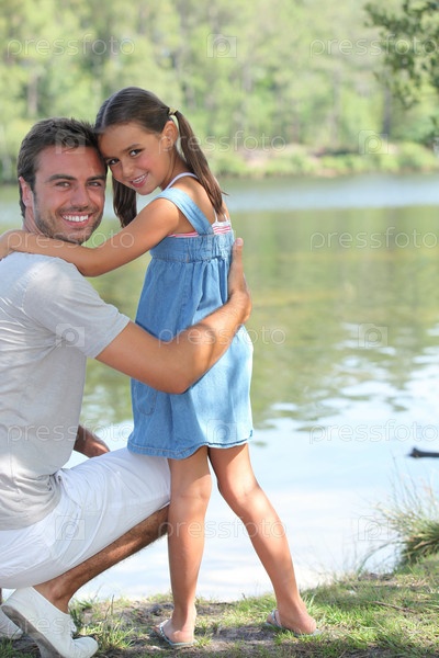 Отец и дочь стоят на берегу реки