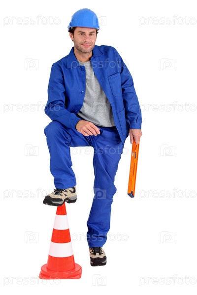Строитель с ногой на дорожном конусе