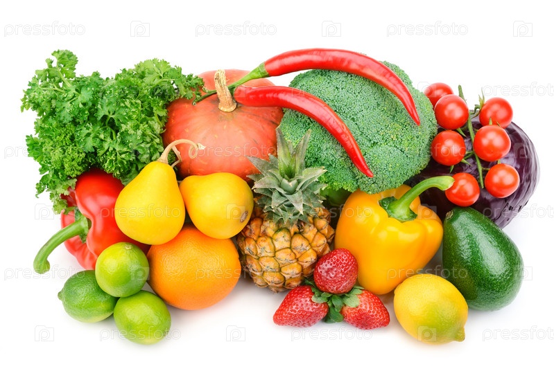 Фрукты и овощи на белом фоне