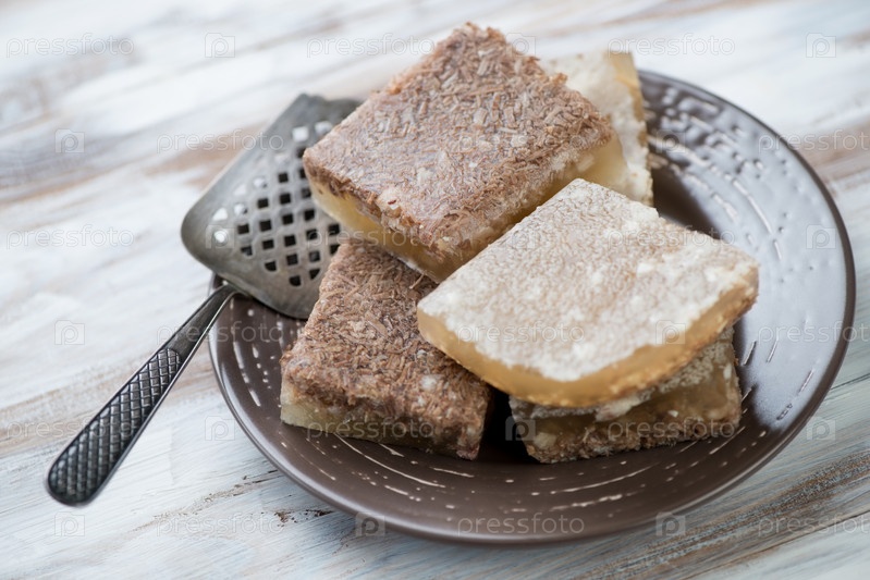 Нарезанный холодец в керамической тарелке