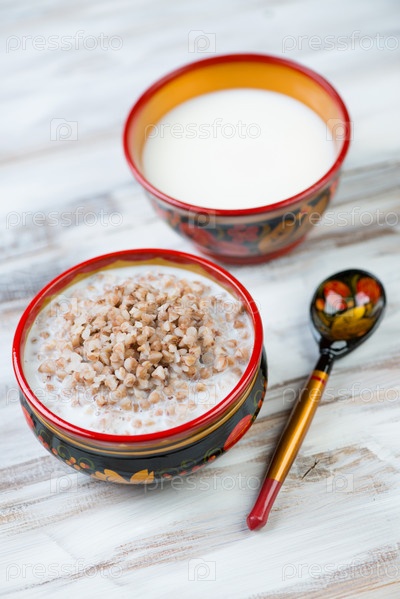 Гречка с молоком в хохломской посуде