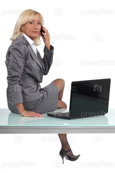 Светловолосая деловая женщина звонит, сидя на столе