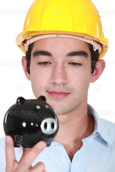 Рабочий смотрит на копилку