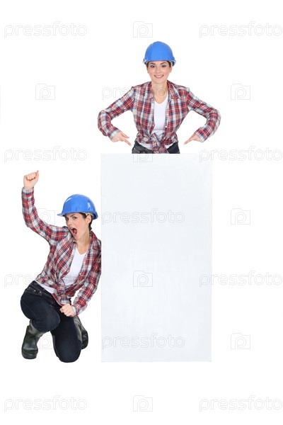 Женщина в синей каске на белом фоне