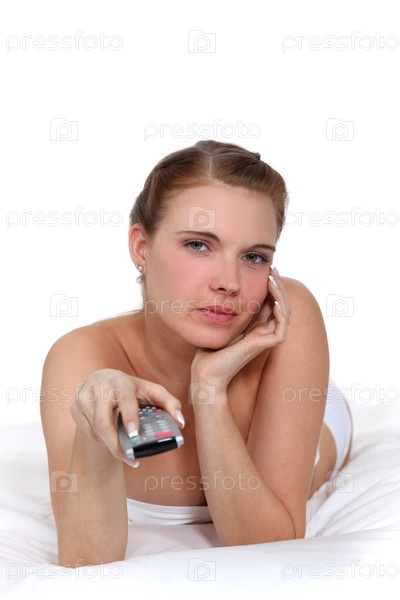Женщина в постели держит пульт дистанционного управления
