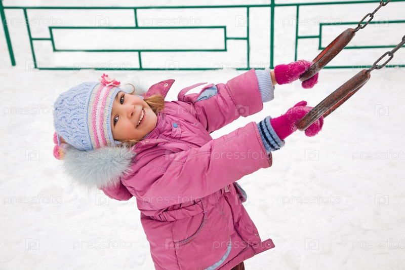 Счастливая маленькая девочка играет на зимней площадке зимой
