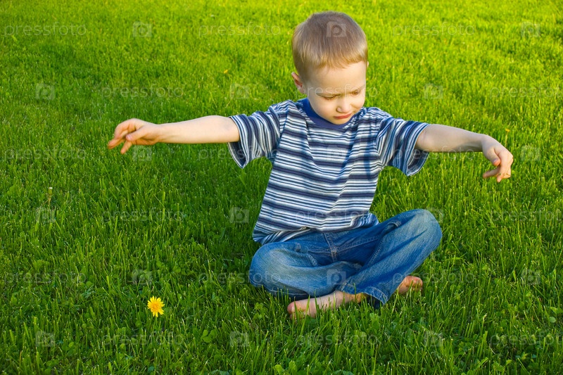 Четырехлетний мальчик сидит на траве