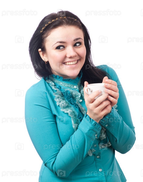 Радостная девушка в бирюзовой блузке с чашкой чая