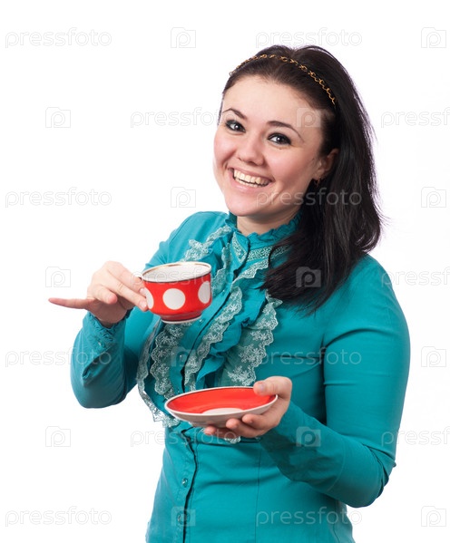 Радостная девушка в бирюзовой блузке с красной чашкой