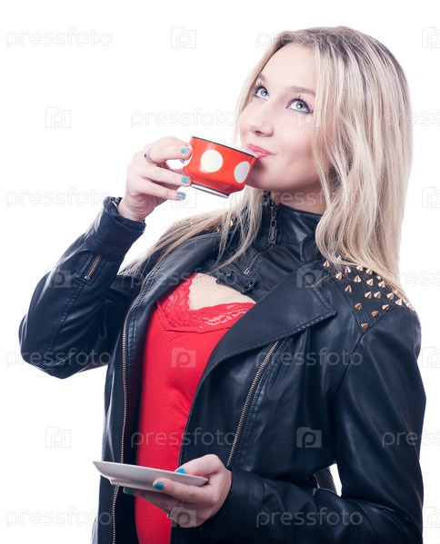 Девушка в кожаной куртке с красной чашкой