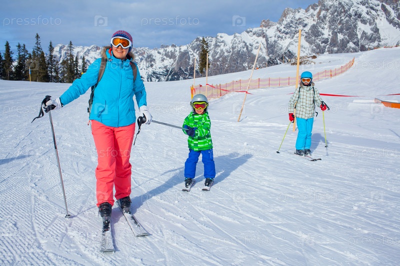 Семья катается на лыжах