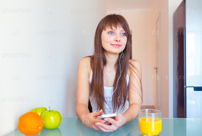 Девушка в наушниках на кухне
