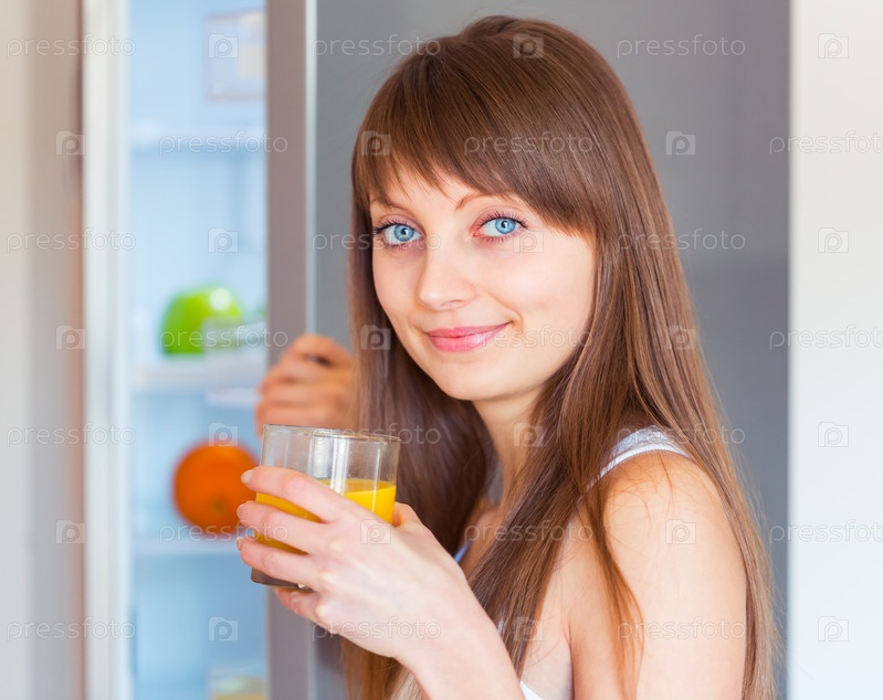 Молодая брюнетка с бокалом сока возле холодильника