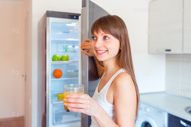 Молодая брюнетка с бокалом сока возле холодильника