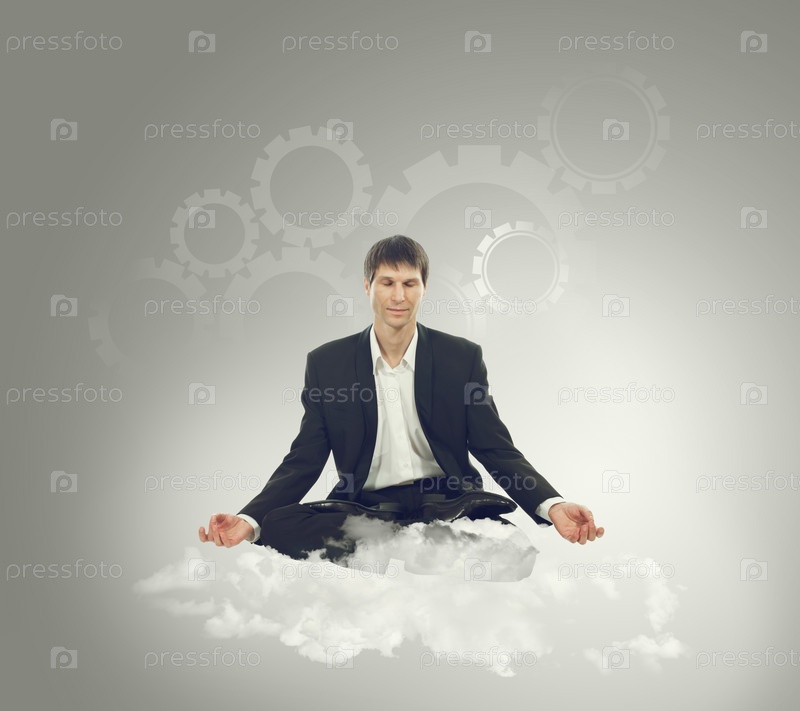 Бизнесмен сидит в позе лотоса на облаке