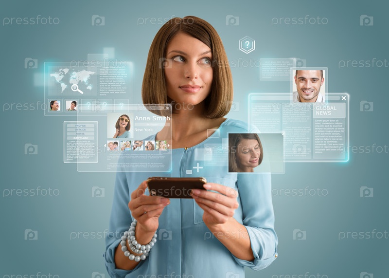 Современная женщин со смартфоном и виртуальным интерфейсом