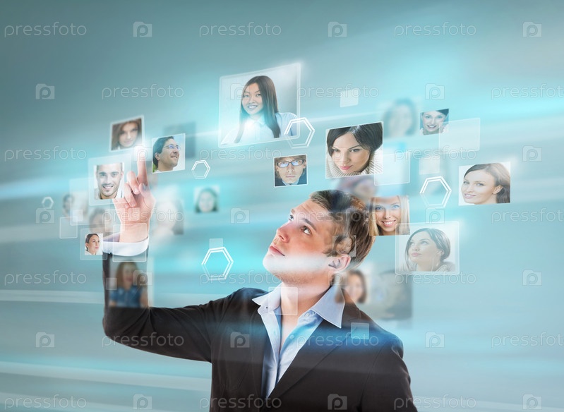 Молодой человек смотрит на фотографии на виртуальном экране