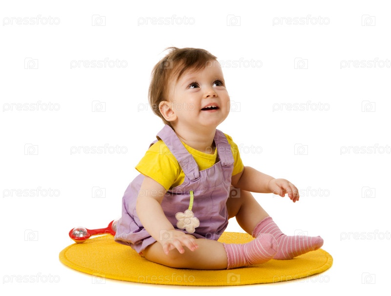 Годовалая девочка играет на коврике