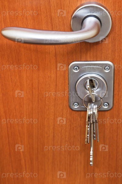 Дверная ручка и связка ключей в замочной скважине