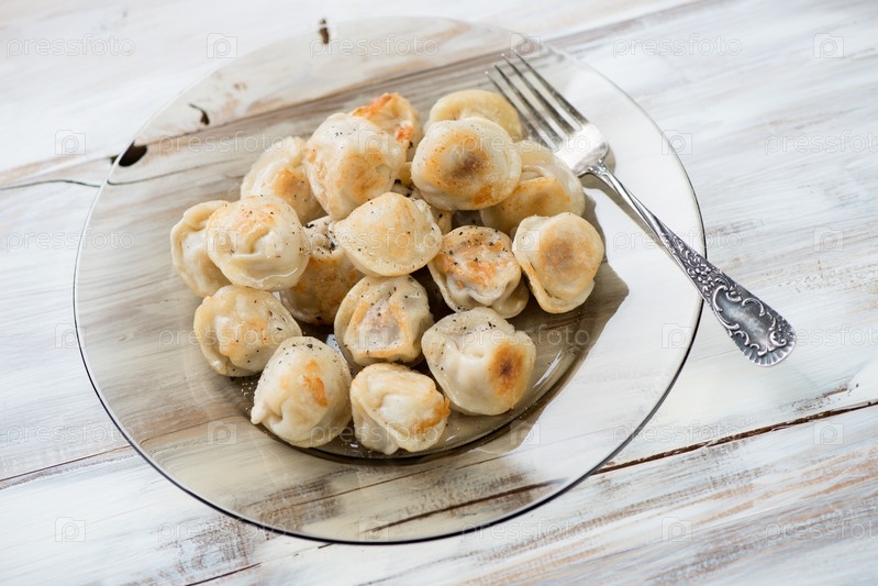 Обжаренные пельмени в тарелке