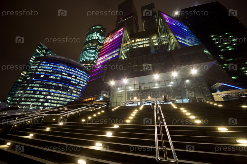 Фасад современного офисного здания в ночное время, Москва