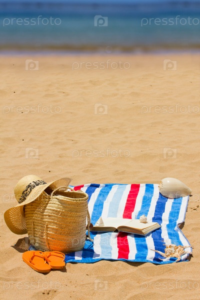 Полотенце, аксессуары для принятия солнечных ванн и книга