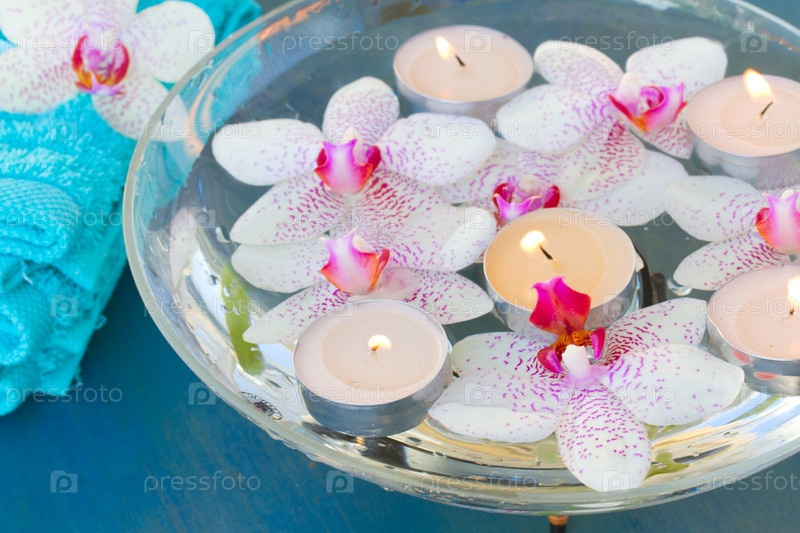 Горящие свечи и розовые орхидеи