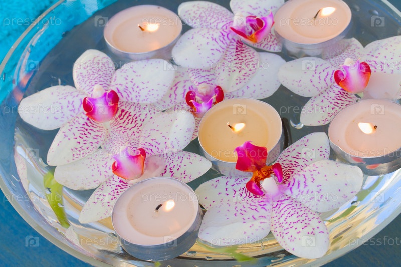 Зажженные свечи и цветы орхидеи
