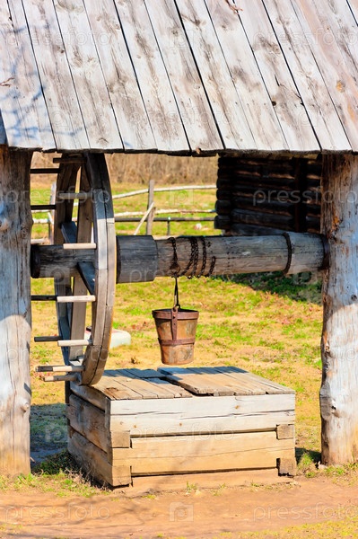 Старый деревянный колодец с колесом