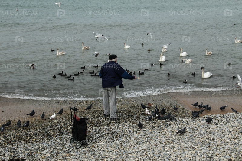 Мужчина кормит птиц хлебом на городском пляже