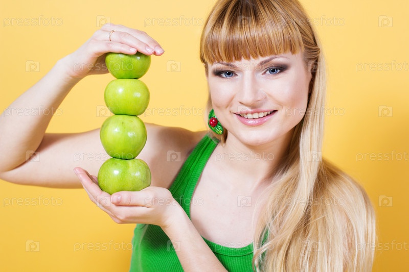 Счастливая блондинка с зелеными яблоками