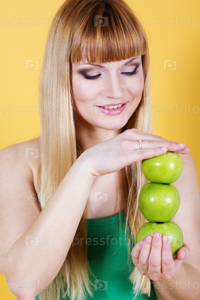 Счастливая блондинка с зелеными яблоками