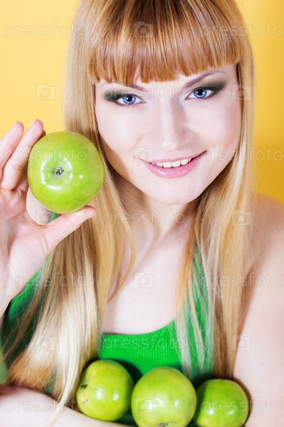 Счастливая блондинка с зелеными яблоками