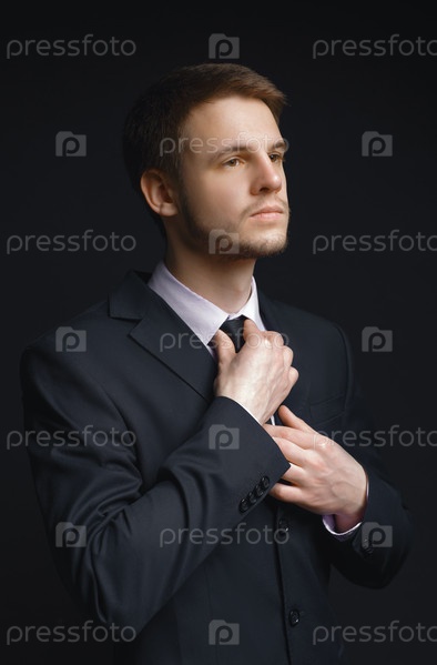 Молодой бизнесмен в элегантном костюме поправляет галстук