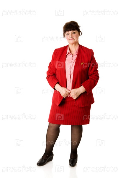 Улыбающаяся женщина в красном костюме на белом фоне
