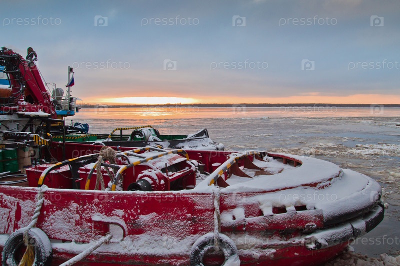 Зимний закат солнца над Северной Двиной. Порт Архангельск