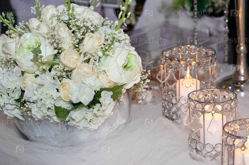 Стол, украшенный свечами, гортензиями и розами