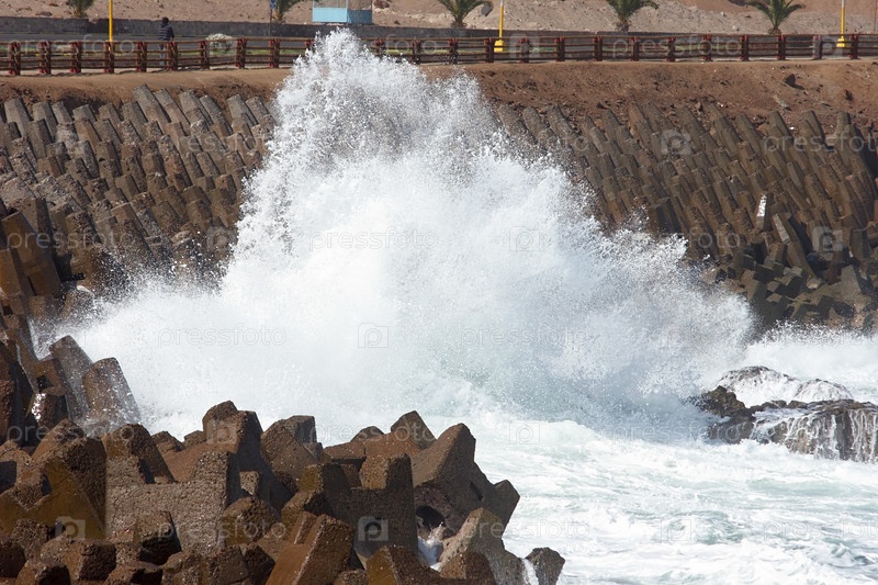 Волна врезается в берег, защищенный переломником воды в гавани Арики, Чили