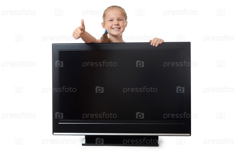 Девочка прячется за жидкокристаллическим телевизором