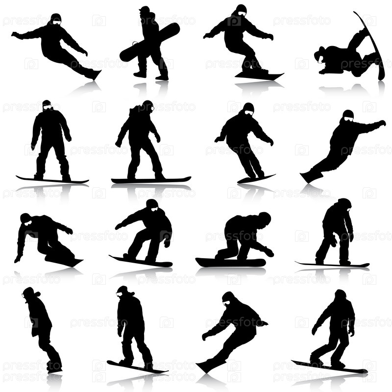 Набор черных силуэтов сноубордистов на белом фоне